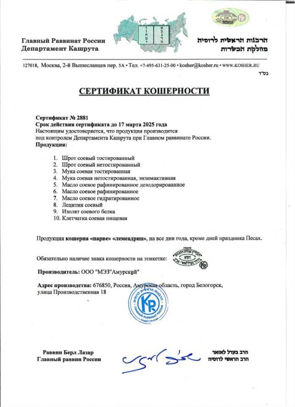 Сертификат кошерности (KOSHER) — это официальный документ, который подтверждает, что изделия соответствуют еврейским религиозным стандартам питания (кашруту).